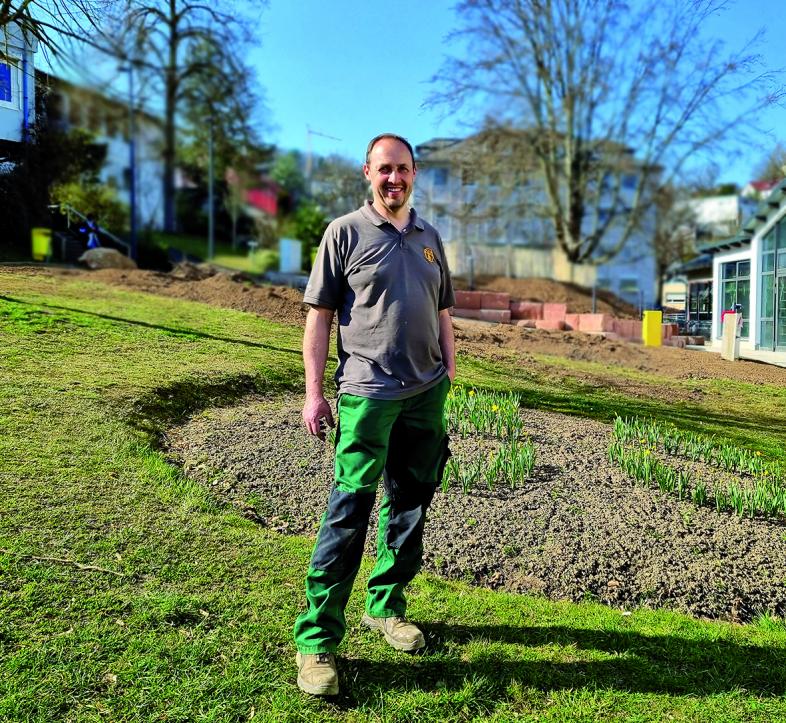 Thorsten Knöppel steht freundlich lächelnd in seiner Gärtnerkluft vor dem runden Blumenbeet auf der großen Wiese auf dem Campus. Die Sonne scheint, vereinzelt blühen schon Narzissen im Beet.
