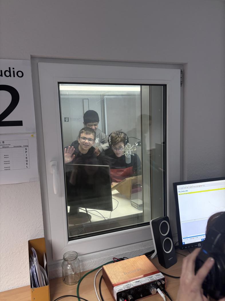 Durch das Fenster der schallgeschützten Sprecher*innenkabine der DBH schauen drei fröhliche Schüler.