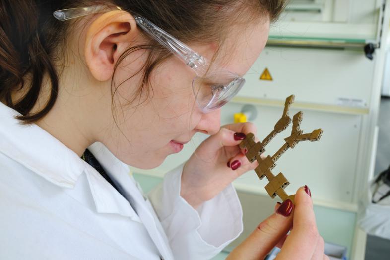 Dr. Tobias Mahnke | Schulischer Alltag: eine Doppelstunde Englisch, große Pause, zwei Stunden Chemie, gefolgt von Mathe, Mittagspause, Religion … und alles immer unter den curricularen Vorgaben des Kultusministeriums. Dem zu entfliehen, zumindest für einen Tag, gelang dem Chemie Leistungskurs!Die mit 12 motivierten Schülerinnen und Schülern besetzte Lerngruppe unter der Leitung von Dr. Tobias Mahnke und Tanja Schapat nutzten die Gelegenheit der nahen Universität, suchten und fanden spannenden außerunterrichtlichen Erkenntnisgewinn. Im Unterricht bleibt oft viel zu wenig Zeit für experimentelle Überprüfungen theoretischer Inhalte. Eine Win-Win-Situation also, dass Studenten des Lehramtes Chemie als Prüfungsleistung einen experimentellen Lernzirkel konzipieren und mit einer „echten“ Klasse durchführen müssen. Die Herausforderung: Die nahezu ausschließlich visuelle Chemie-Methodik auf unsere Schüler anpassen! An dieser Stelle zeigte sich schnell, dass die Studenten überaus motiviert waren: Neben Unterrichtshospitationen in der betreffenden Lerngruppe haben sie in intensiven Gesprächen mit Herrn Mahnke sich die nötigen Kniffe angeeignet und – mit vielerlei kreativen Ideen aufgewertet – letztlich im Labor auch umgesetzt. Neben Papp-Molekülen in der im Unterricht verwendeten Magnetsymbolik (Abb. 1), Reaktionskontrolle mittels akustischen Leitfähigkeitsmessern und taktilen Puzzeln konnten die Schüler als ein selbst hergestelltes Reaktionsprodukt nach Schokolade duftende Seife mitnehmen.