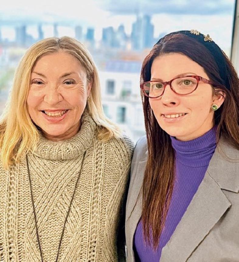 Auf dem Bild sind Martina Borghardt und Kristina T. vor der Frankfurter Skyline zu sehen, die fröhlich in die Kamera lächeln.