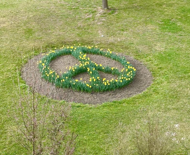 Auf dem zweiten Bild aus diesem Frühjahr sind die Narzissen in der Blüte, man erkennt ein rundes Peace-Zeichen