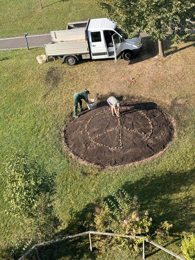Auf dem ersten Bild sieht man zwei Mitarbeiter der BauTechnik, die im Herbst ein rundes Blumenbeet bepflanzen.