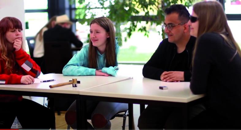 Valery, Nele, Furkan und Aileen sitzen draußen an einem Tisch