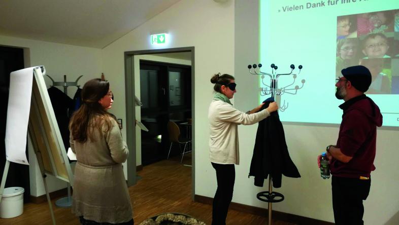 Will man eine Fähigkeit fördern, sollte diese zum Entwicklungsstand des Kindes passen und das Kind sollte über die notwendigen Lernvoraussetzungen (z. B. motorische, geistige) verfügen. Um sich bewusst zu machen, welche einzelnen Teilschritte die Handlung umfasst und wie die Handlung genau funktioniert, ist eine Handlungsanalyse notwendig. Um die Technik der Handlungsanalyse zu erlernen, wurden wir in der anschließenden Kleingruppenarbeit „Ich muss selbst ausprobieren, was ich meinem Kind beibringen möchte!“ in vier Gruppen aufgeteilt. Wir hatten die Aufgabe, zu jeweils einer Fertigkeit (mit Löffel essen, Jacke anziehen, Knoten in Schnürsenkel machen, Knopf schließen) eine Handlungsanalyse zu schreiben. Dabei haben wir festgestellt, dass diese Aufgabe sehr komplex ist. Zum einen führen immer mehrere Lösungsmöglichkeiten zum Ziel und zum anderen ist es häufig sehr schwer, eine Handlung so zu beschreiben, dass sie eindeutig und auch ohne Sehvermögen gut nachvollziehbar ist. Hier haben wir auch gelernt: Bevor man, eine komplexe Fähigkeit fördern will, sollte man den Handlungsablauf bereits selbst unter der Augenbinde erprobt haben, um sich die Teilschritte der Handlung und den genauen Handlungsablauf bewusst zu machen. Zudem löst man unter der Augenbinde manche Aufgaben anders als mit sehender Kontrolle. Abgeschlossen haben wir diesen ersten sehr informativen und arbeitsreichen Tag mit einem gemeinsamen Abendessen, erfrischenden Getränken und tollen Gesprächen.