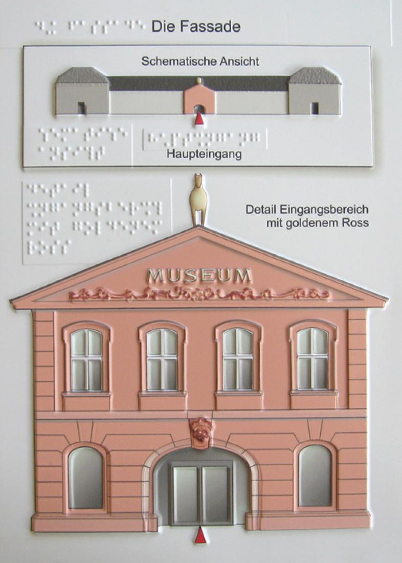 Übersichts- und Orientierungsmodelle helfen großen und kleinen Besuchern, sich im Museum zurechtzufinden. Sie geben Grundinformationen, stellen Lageverhältnisse dar und liefern Informationen, um den Aufzug, die Kasse oder die Waschräume zu finden.