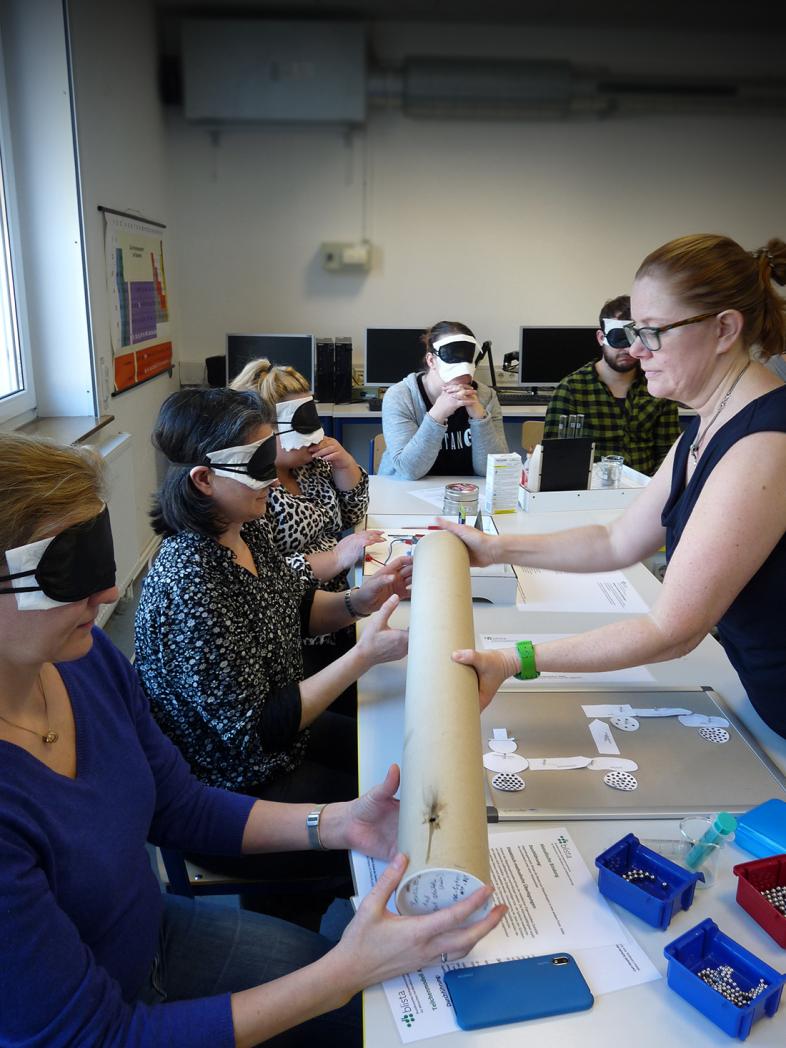 Nach der Vorstellung der blista und einer kurzen Betrachtung blindenspezifischer Herausforderungen, ging es für die Teilnehmenden direkt unter die Augenbinde, um erste Selbsterfahrungen zu sammeln: Es galt, diverse Tiermodelle sowie eine Schwellkopie zu ertasten. Hierüber entspann sich eine sehr interessante Diskussion über den Einsatz dieser Materialien im Unterricht. Im Anschluss wurden die vielfältigen Möglichkeiten der Gestaltung und Darstellung von Bildern für blinde und sehbehinderte Schülerinnen und Schüler in den Fokus gerückt und die Einsatzmöglichkeiten von Gallusbrett, Schwellkopie oder Tiefziehfolie näher erläutert.