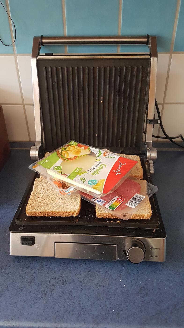 „Du schon wieder?!“ – „Du auch schon wieder!? Ich habe Hunger!“ Die Packung mit dem Sandwichtoast wurde geschnappt. Sechs Scheiben Toastbrot wanderten auf ein Schneidebrettchen.