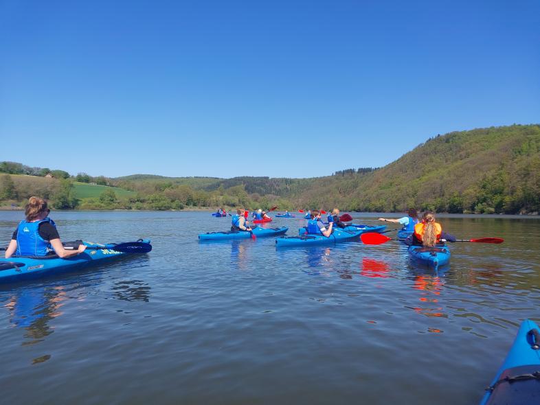 Kurz: Es geht wieder an den Edersee! Wie jedes Jahr um diese Zeit findet das Wassersportprojekt auf dem Gelände der Marburger Philipps-Universität in Asel am Edersee statt. Eine gute Tradition dabei: Die Boote und das Gepäck werden gefahren, die Schüler*innen legen diese Strecke in 5 Etappen wechselweise entweder in den Kleinbussen oder auf Tandems zurück. Und eigentlich hatte es das Wetter gut mit uns gemeint.