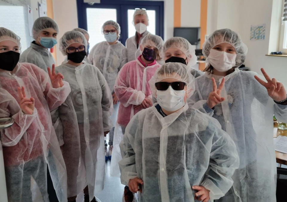 Die Klasse 5b der Carl-Strehl-Schule in Hygienekleidung