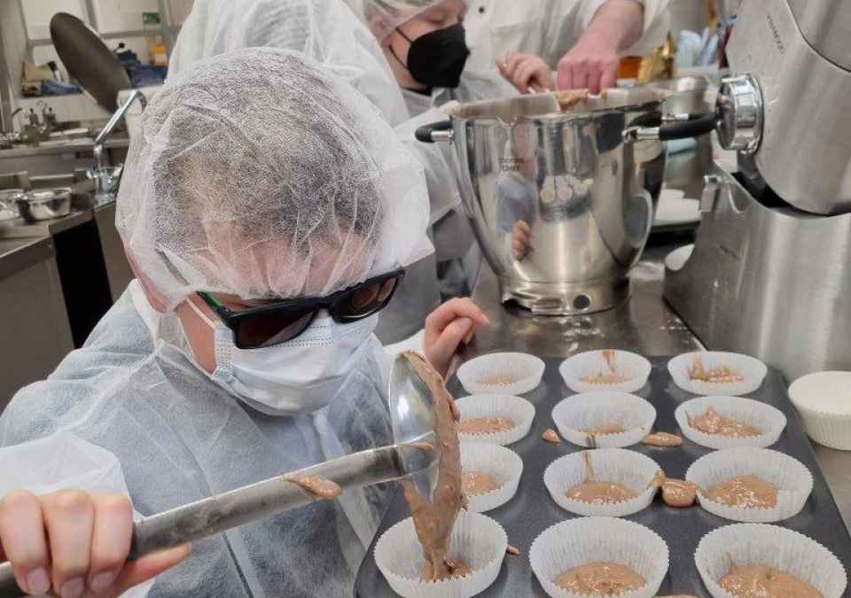 Eine Schülerin füllt den Teig in die Förmchen