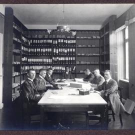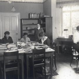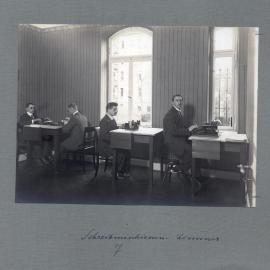 • In einem Schreibmaschinenzimmer sitzen vier junge Männer bei der Arbeit