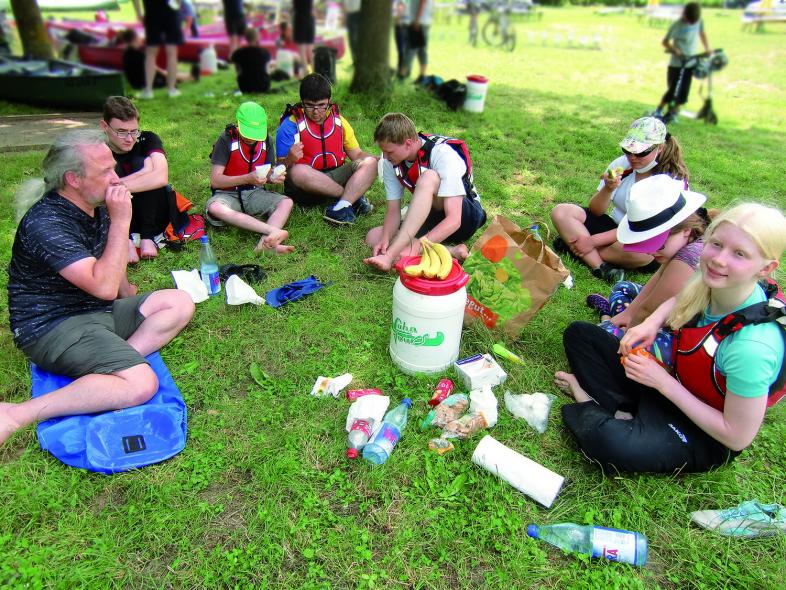 Nach gut zwei Stunden Fahrt kommen wir in Odenhausen an, ungefähr die Hälfte der Tagestour, wo wir erst mal aussteigen und auf der Wiese picknicken. Zum Nachtisch ein Eis vom Kiosk vor Ort, so lässt sich`s leben. Gut ausgeruht, gehen wir wieder in die Boote. Ein kurzer Blick zum Himmel lässt uns kurz die Stirn runzeln, da kommen dunkle Wolken…