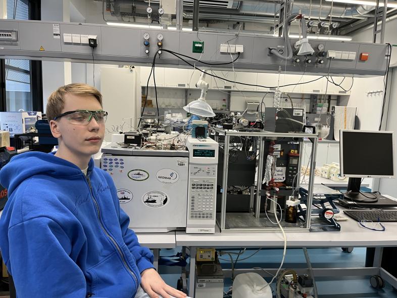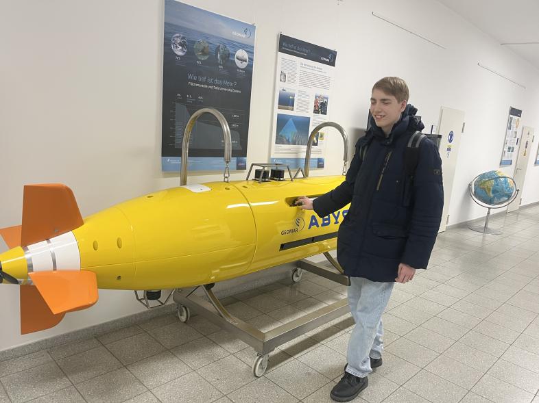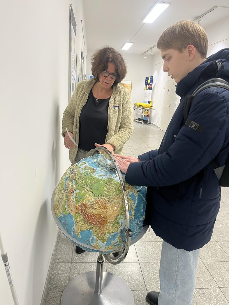 Dirk Nürnberg aus der Paläoozeanografie erklärte uns die Temperaturentwicklung der Erdgeschichte. Erik erforschte das Modell des autonomen Unterwasserfahrzeuges "ABYSS" und auch der profilierte, taktile Globus fand unsere Begeisterung. Auch die Zirkulation der Ozeane, verschiedene Mess- und Darstellungsmethoden, Ozeanmodelle, Paläoozeanographie, Klimavariabilität und Ozeanversauerung standen auf dem Programm. Zudem befassten wir uns mit Ostseefischen, Quallen und Nahrungsnetzen, der Bürgerbeteiligung in der Ozeanbeobachtung, zum Beispiel auf Segelbooten, der Erforschung der Atmosphäre sowie mit dem Forschungsdatenmanagement und dem marinen Bibliothekswesen. Abgerundet wurde das Praktikum durch die Besichtigung von Geräten zur Tiefseeforschung, des Schülerlabors und der interaktiven Ozeanausstellung "SEALEVEL". Darüber hinaus erhielten die Schüler*innen spannende Einblicke in den Medienalltag des GEOMAR – inklusive eines Drehtags für Madison – sowie in die wissenschaftliche Arbeit an Publikationen und Forschungsanträgen.